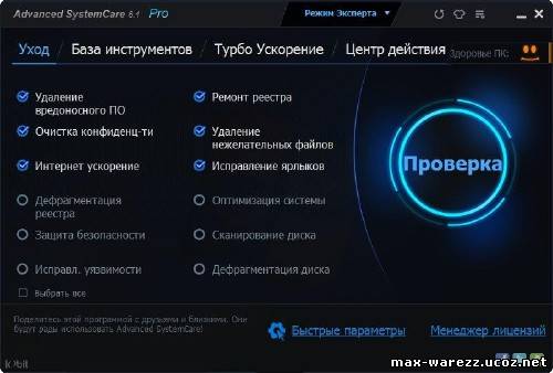 Advanced SystemCare - программа, включающая в себя множество модулей для оптимизации, настройки и повышения производительности компьютеров, находящихся под управлением операционными системами Windows 2000/XP/Vista/7/8.